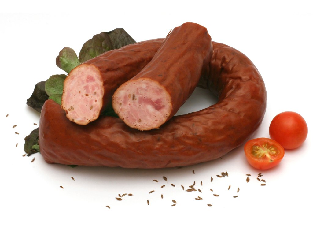 Točený salám s většími kousky masa zauzený komínovou metodou.